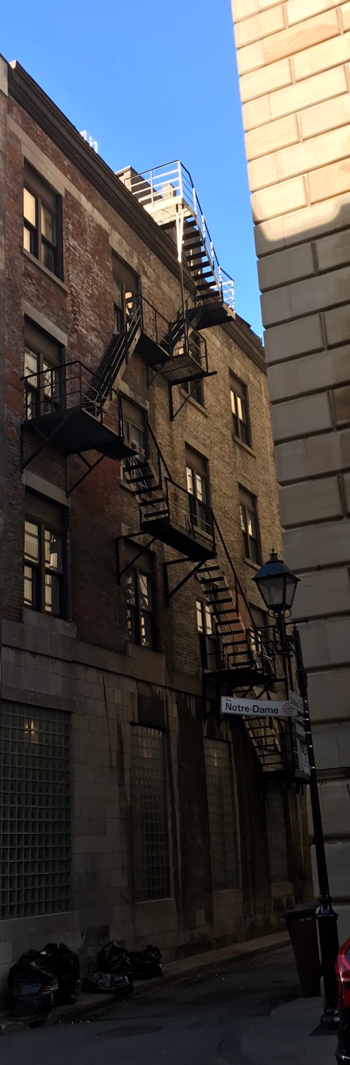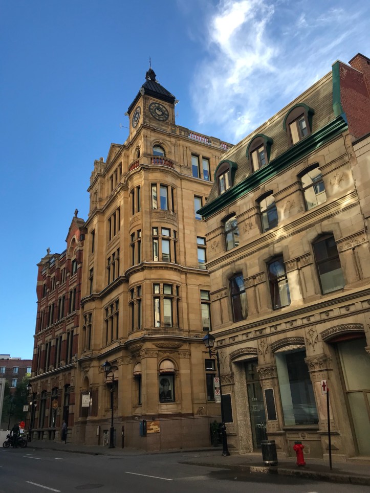 In het ochtendzonnetje ontbijten met een gevulde hartige pannenkoek met maple syrop en een dubbele espresso, nadat we een kopie van de Notre Dame gezien hebben en de haven van Montreal. Heerlijk rustig aan de dag beginnen.