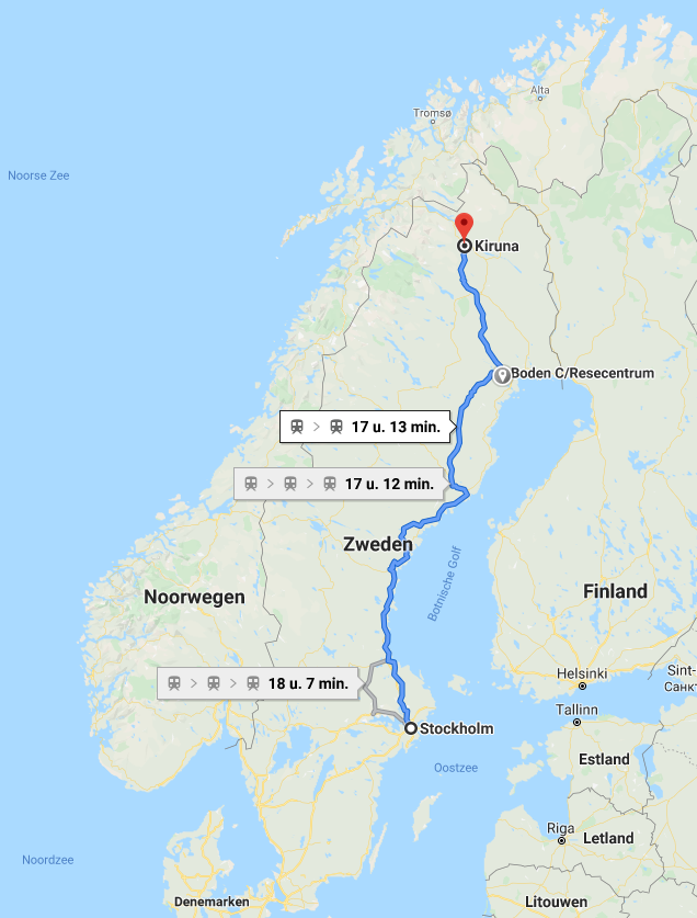 Eenmaal in de trein worden we gecontroleerd door de conducteur, die ons meldt, dat we om 15.15 uur de volgende dag in Kiruna aan zullen komen. Wut?! Gauw een hotel geboekt in Kiruna, zodat we in elk geval kunnen overnachten en dan de dag daarná dan maar ’s morgens starten aan de trail. Foutje, dat later door de Zweedse spoorlijnen helemaal goed gemaakt is. Hotel + treinreis terugbetaald gekregen. Super service.