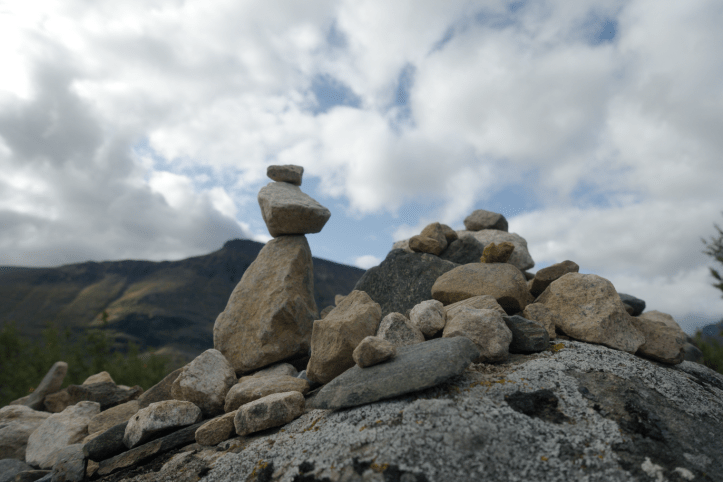Het fijne daarvan is, dat je niet zoveel mensen tegenkomt, je iets meer moet zoeken naar de route. Wat het leuk en uitdagend maakt. Er zijn af en toe een soort wegwijzers door mensen gemaakt, door een serie (lei)stenen, die ze gestapeld hebben. Dat helpt wel.
