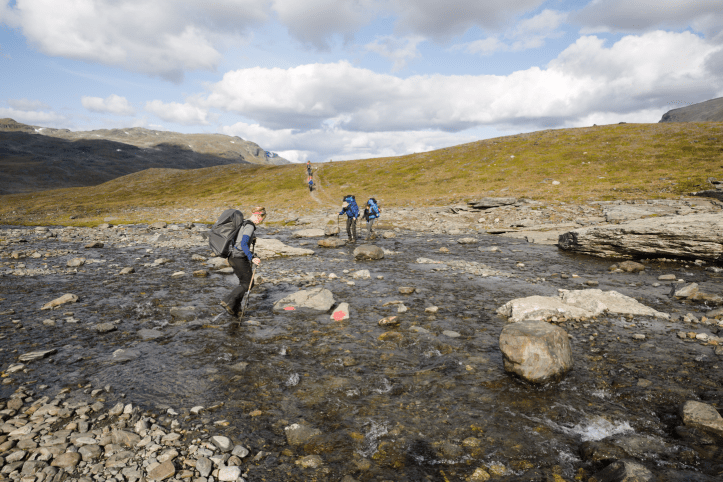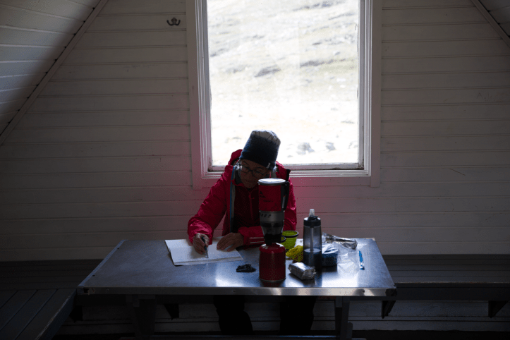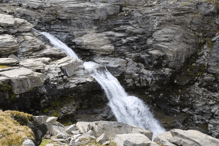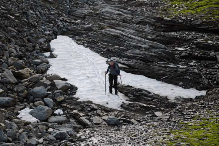 Misschien was het voor anderen of in een ander jaargetijden zwaarder. Minder water in de stroompjes aan de start, we kunnen het niet beoordelen. Maar voor ons was het best wel een ‘meevaller’. Even spannend, maar niet té lang en niet teveel. Dus heel tevreden boven gekomen. Lunch bij de hut. Even boekje bijgewerkt, zodat de Trailguard ons kan vinden, mocht het hierna mis gaan. Wat trouwens gelukkig niet het geval is!