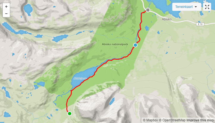 Deze dag willen we lopen naar de campground, die in het National Park van Abisko op ongeveer twee-derde van de route, die je hierboven op de kaart ziet, ligt. Het weer is redelijk. Droog en half bewolkt, prima wandelweer dus.