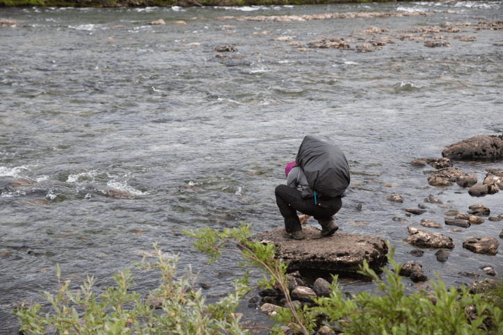 Na een uurtje of drie a vier wandelen komen we bij de Campground. Het stinkt er naar poep, het is er drassig en er zijn gezinnen aan het picknicken. Het is er druk. En blijkbaar zijn de droogtoiletten sinds de Fjallraven Classic niet meer geleegd. Had ik al gezegd, dat het er naar poep stonk?!