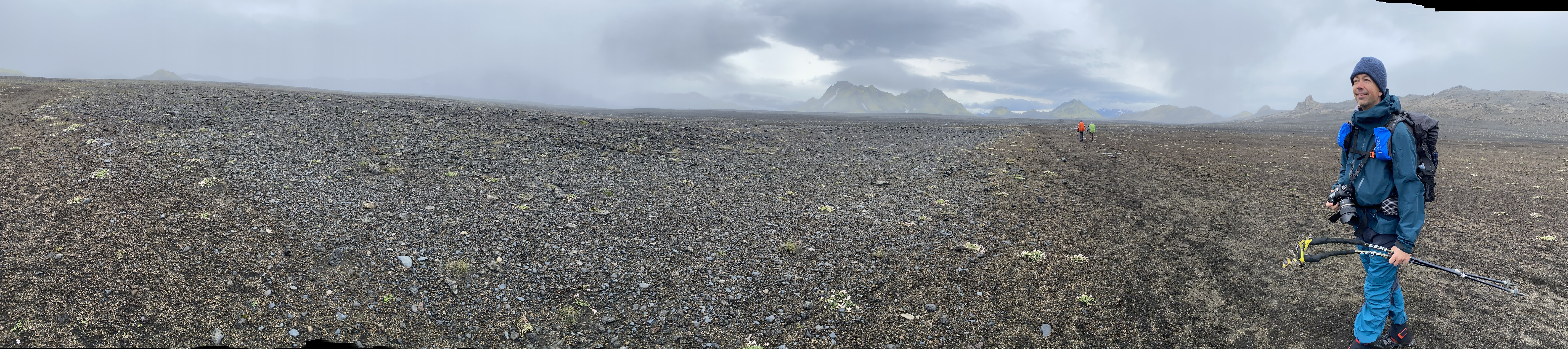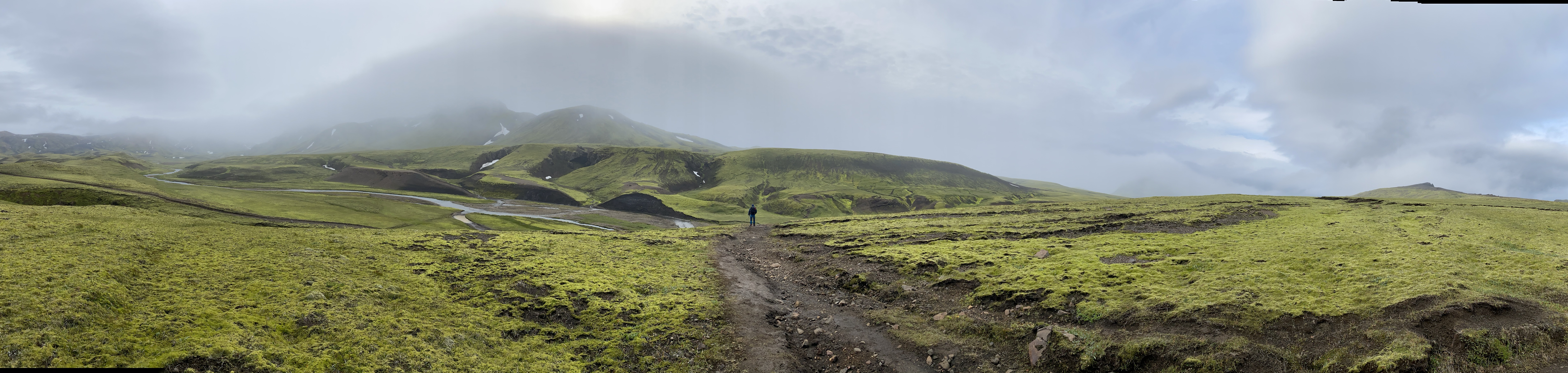 Langzaam komt de mist en drizzle weer op en lopen we door afwisselend groen landschap en zwart lavagrind met keien. Als je in het lavalandschap loopt in de mist is het net een spannende film en verwacht je een trol achter elke stapel stenen.