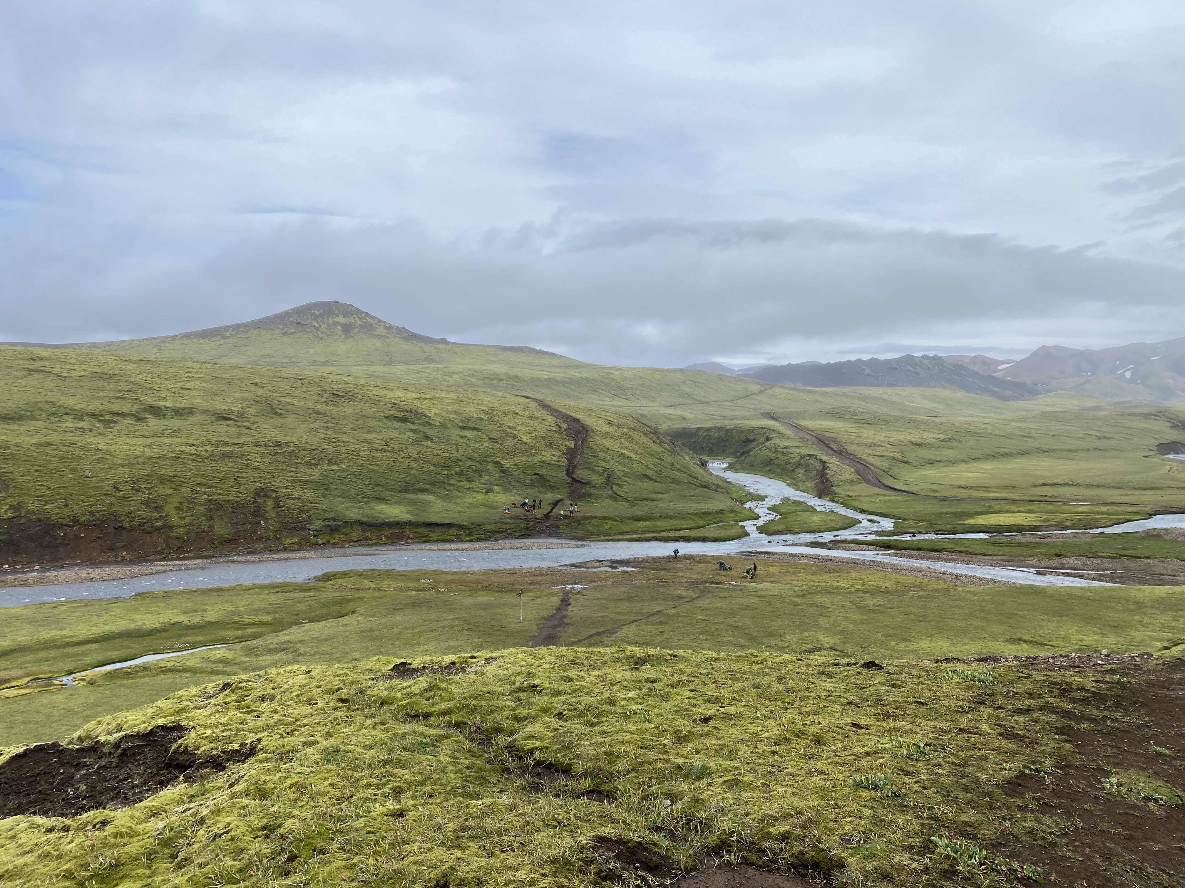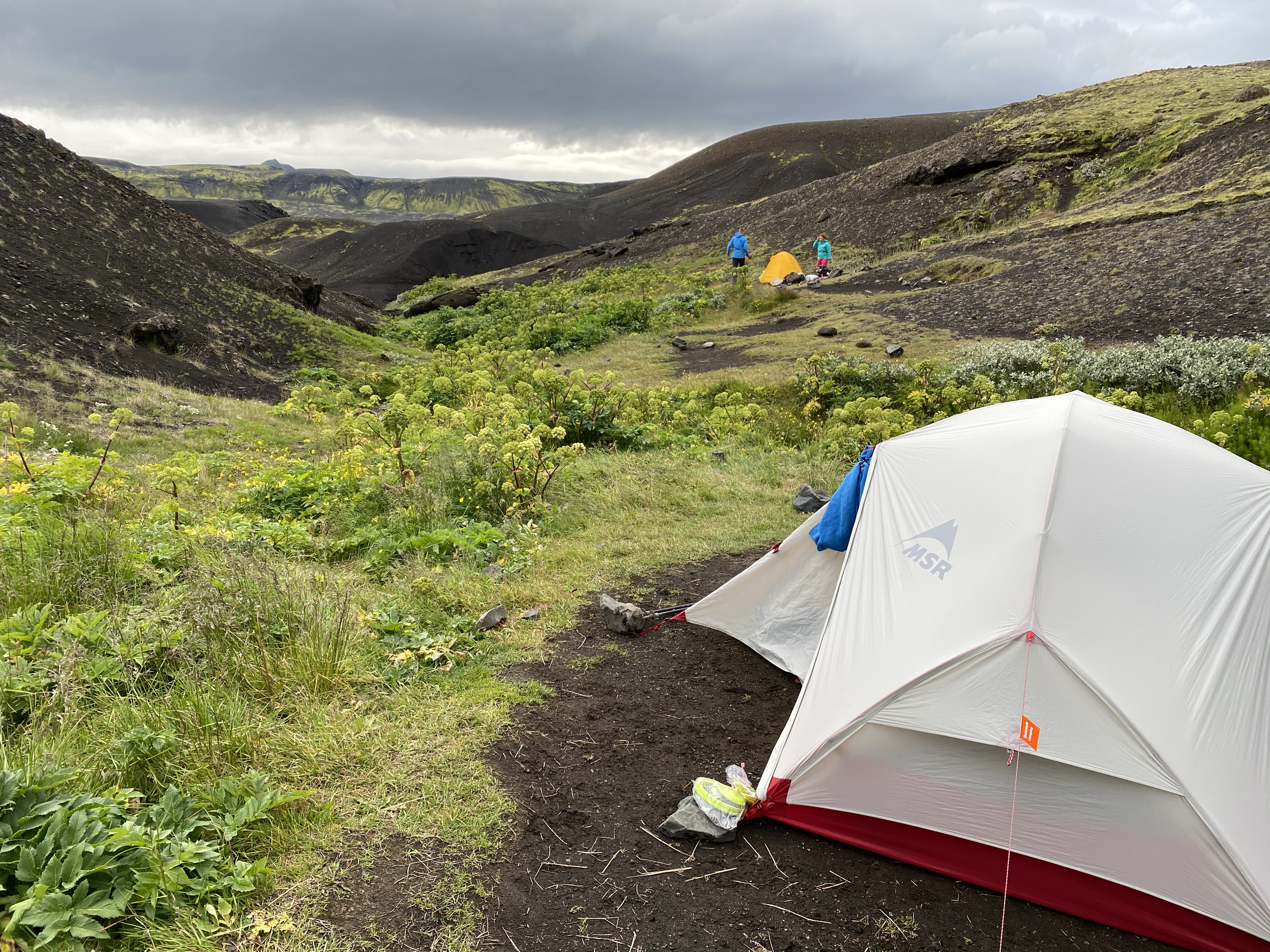Het waait gelukkig stukken minder, maar het blijft stemmig weer. We wandelen lekker op deze vlakte. Uiteindelijk komen we na een tweetal bergen bij onze camping. Wow! Wat is het hier mooi! En we zijn een van de eerste dus kunnen op ons gemak de perfecte slaapplek zoeken.