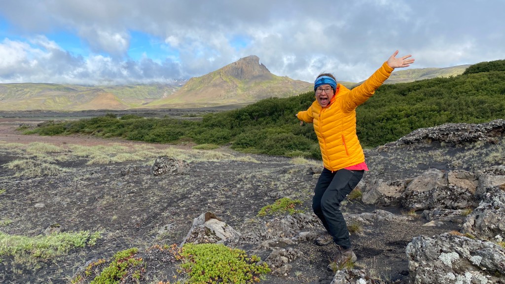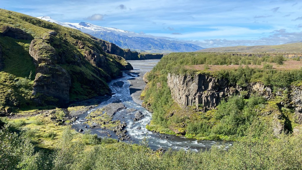 Een stuk verderop op ca. 5 km van þorsmörk af komen we op een schitterend uitkijkpunt. Het wordt hier ineens zomer!