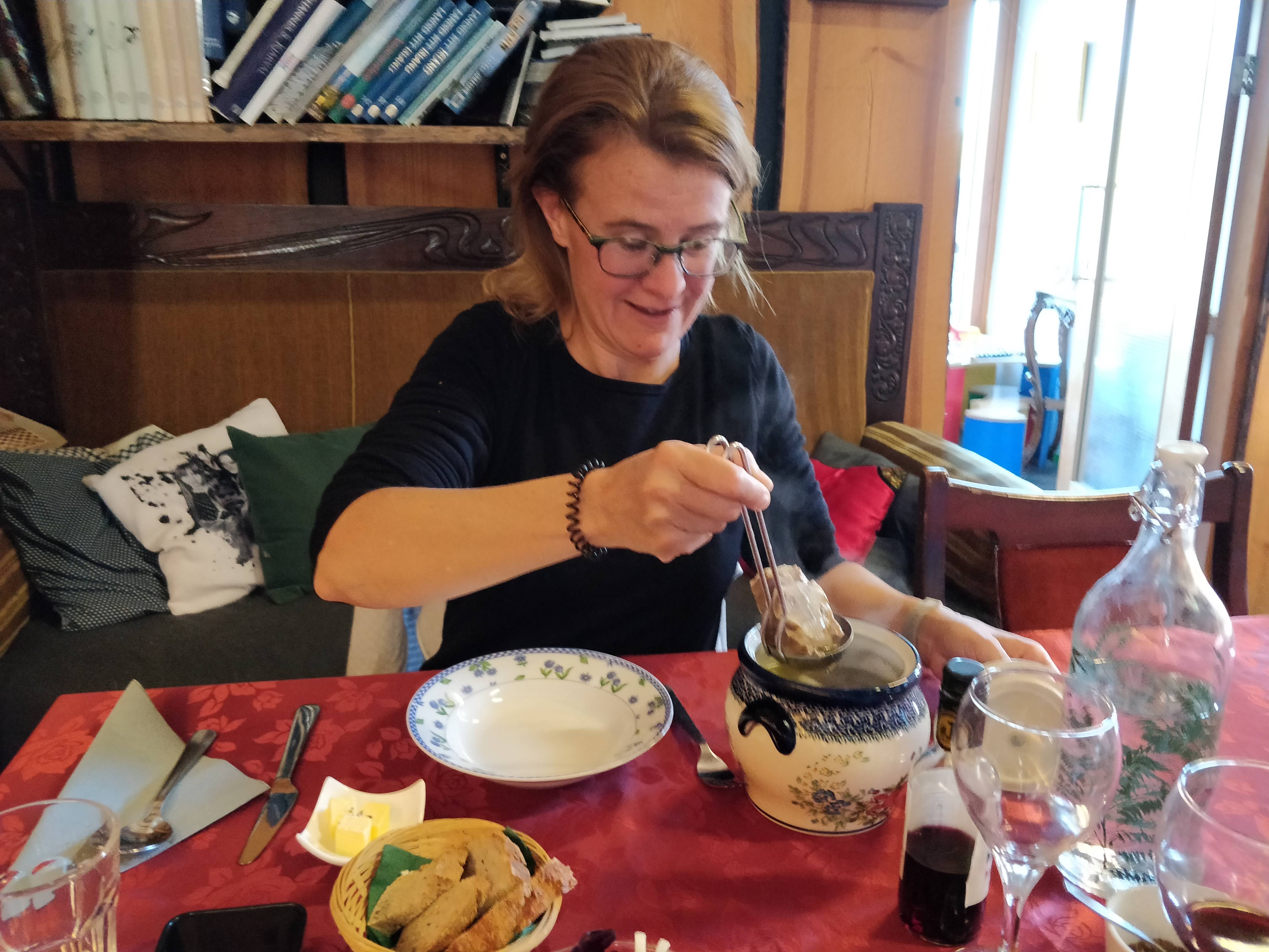 Vanavond eten we op de boerderij hier. Iceland’s diner: beiden de gerookte puffin vooraf en lam meatsoup en een lam stoofpotje als hoofdgerecht.