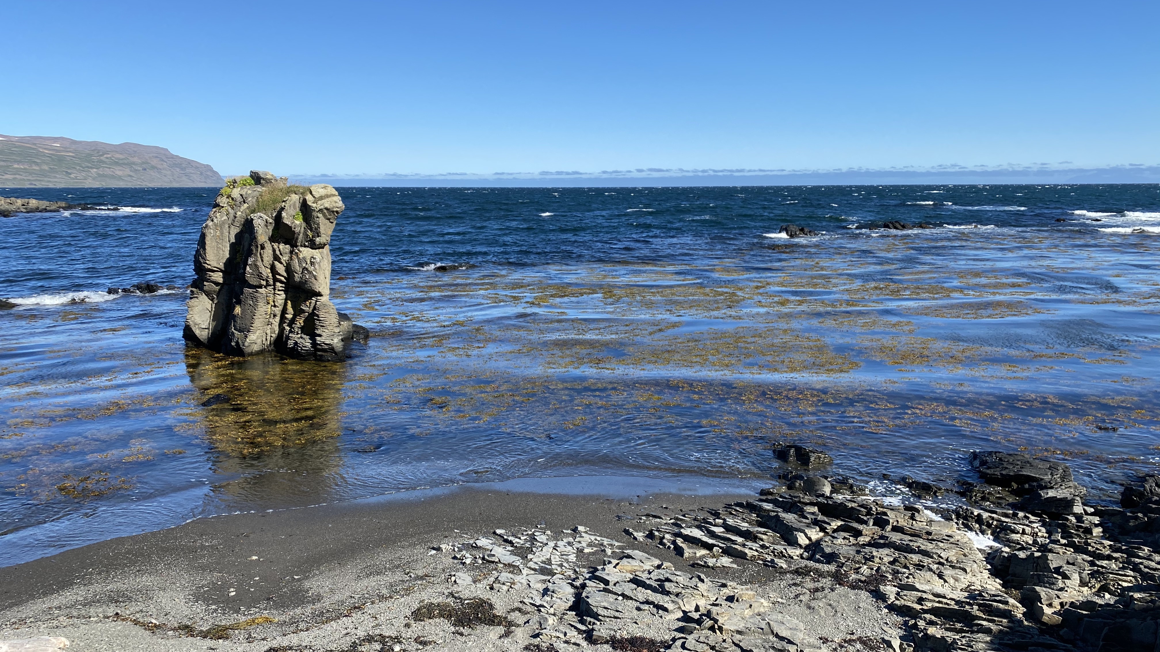 Na Drangsnes stoppen we bij een baai met ladingen aangespoeld hout. Koffie en crackers met chocopasta en pindakaas. Mmmm 😋