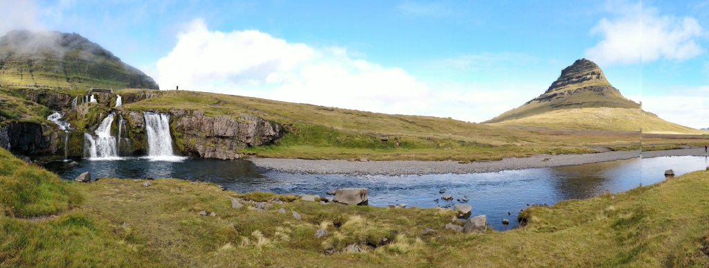 Eerst rijden we een kwartier terug op de route van gisteren om de Kirkjufell berg en de watervallen te bewonderen. Het is prachtig weer en het licht valt schitterend op het landschap.