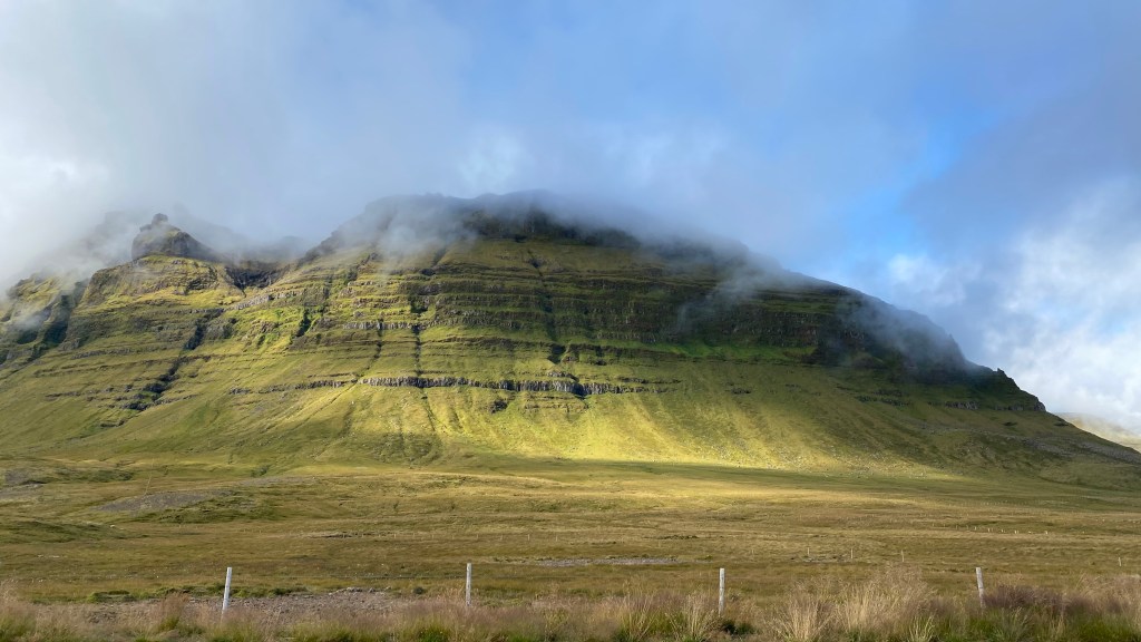 De berg tegenover de Kirkjufell heeft de wolken nog rond de top hangen. Mooi 🤩