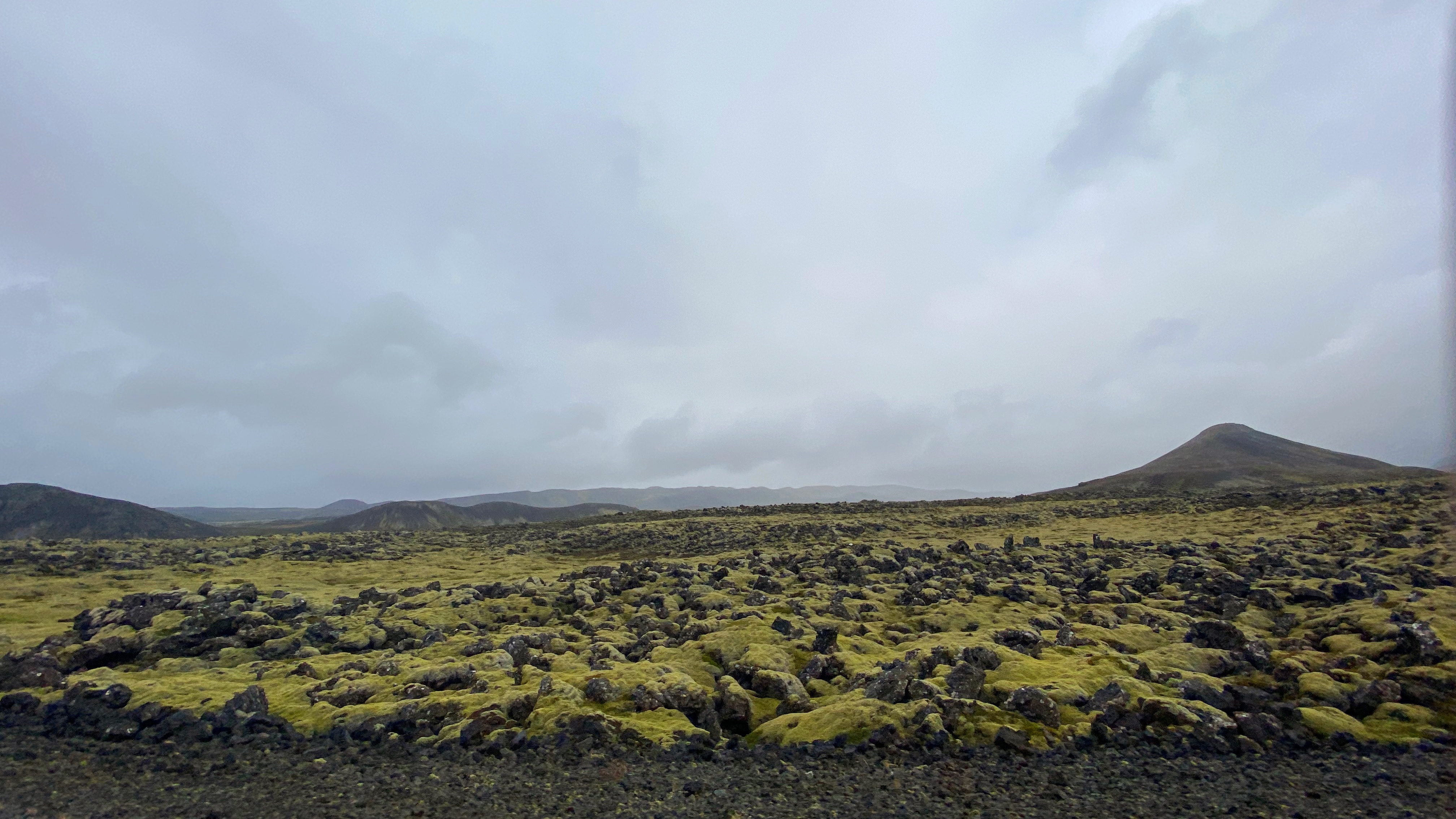Op de weg naar het vliegveld rijden we weer door een lavaveld, bedekt met mos. Bizar gezicht blijft het.