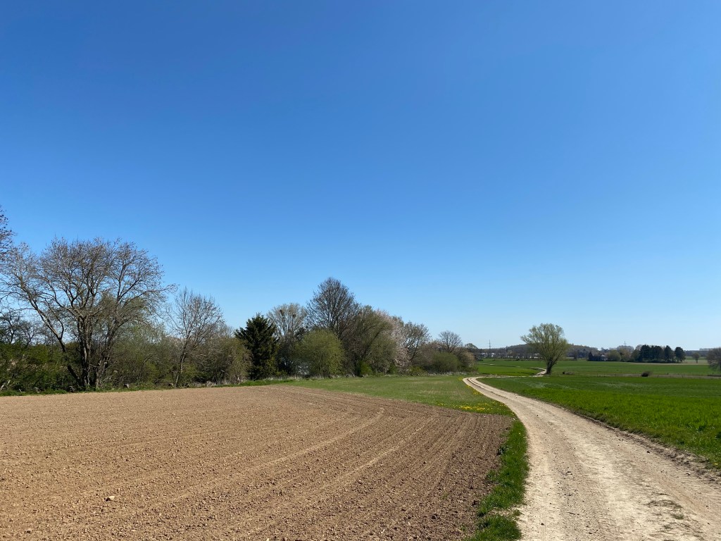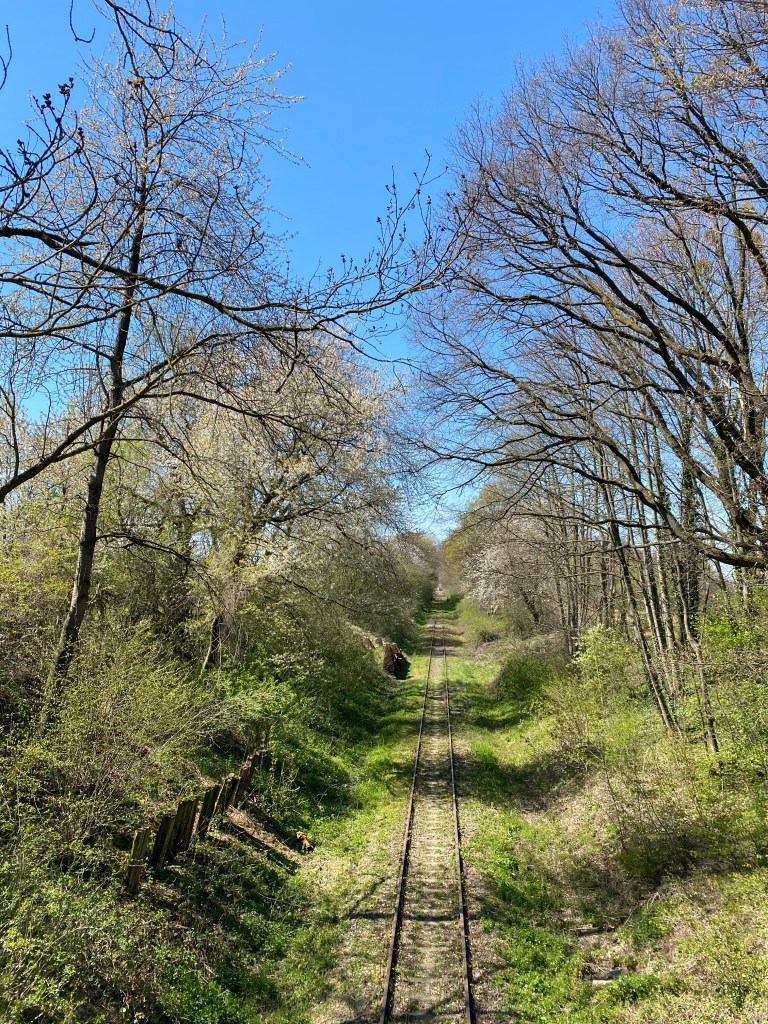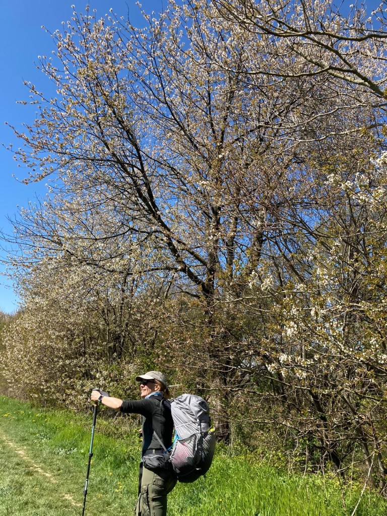 Veel groen en witte bloesem en krijtpaden. Vogels overal. Twee keer een biddend valkje (denken we) gezien.