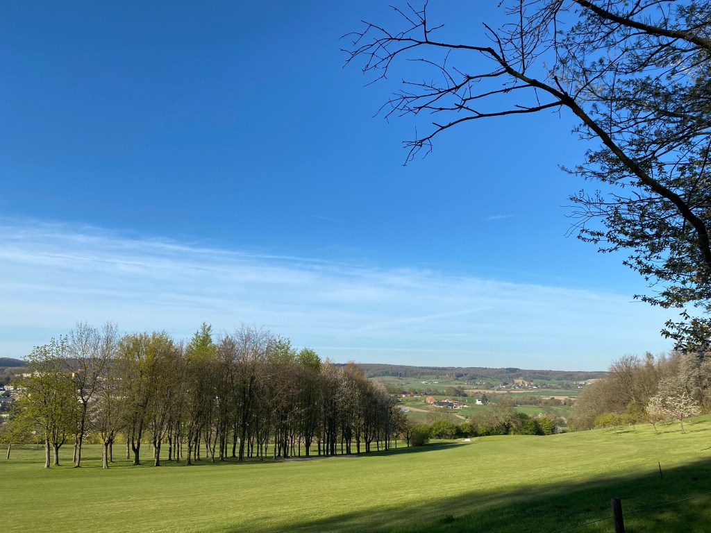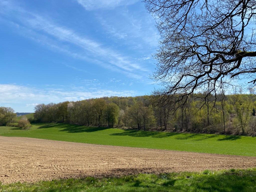 Jaaaa met zon en rijp op het veld vertrekken we vandaag voor een tocht van 25 km, die uiteindelijk ‘maar’ 19,5km bleek te worden. Door het glooiende landschap en tussen wallen en struiken door richting de Schneeberg, maar nu zonder de schnee.