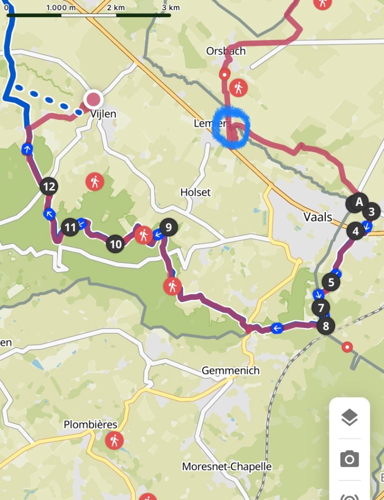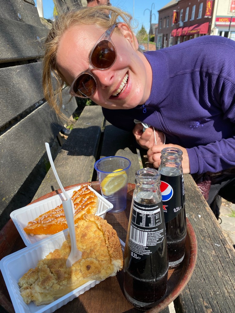 Eenmaal in Vijlen zoeken we naar een afhaaltentje voor koffie, maar bijna wandelen we het dorp alweer uit zonder dat er iets open is. Dus terug naar ons hotel Vijlerhof en daar een lekkere punt en cola zero’s besteld. Om nom… die Limburgers weten wat porties zijn 🤣