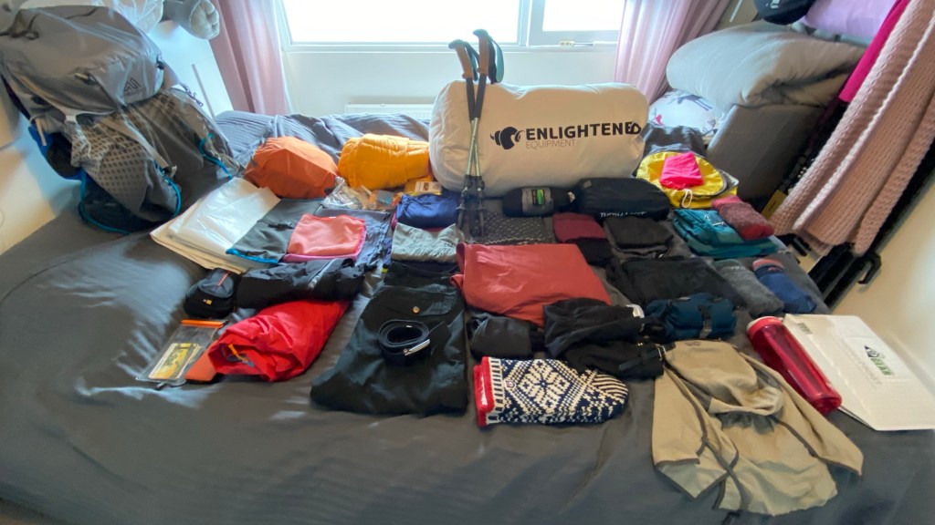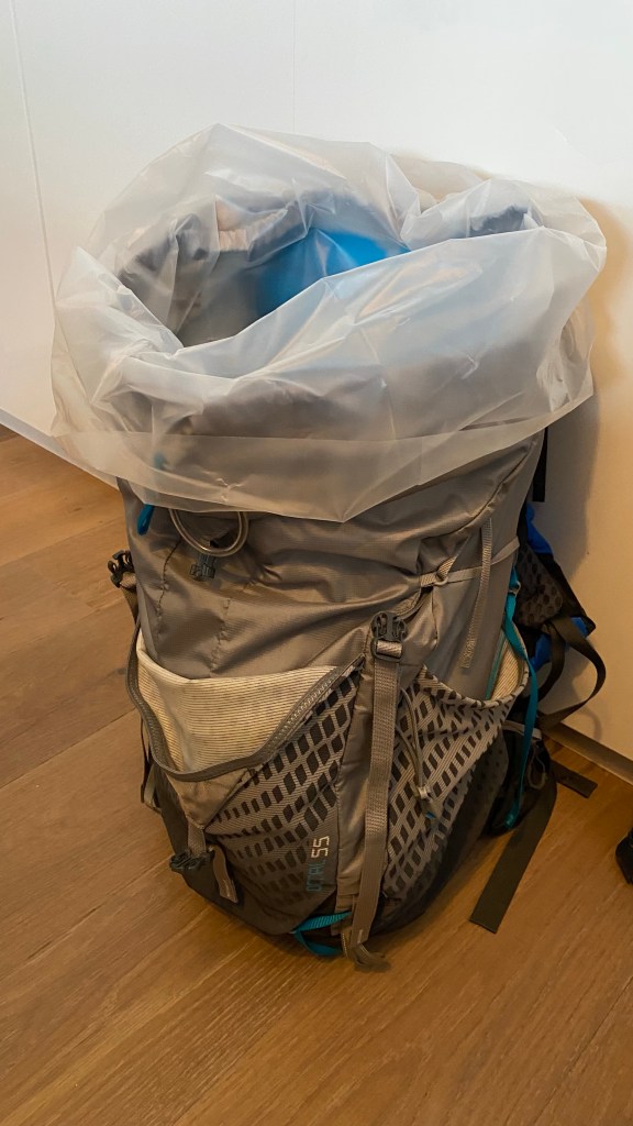 Eerst de donzen quilt in een propzak. En dan de puinzak in de rugzak. Onderin de zak met eten voor 5 dagen en twee Tony’s voor bij de thee😍