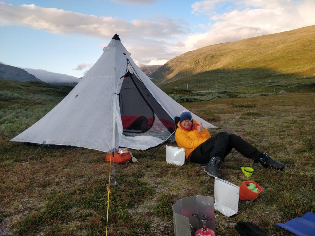 Om 20:00 uur hebben we de tent maar eens opgezet. Bij Vindelfjallen in de buurt op een mooi vlak schiereiland aan een brede stroomversnelling.