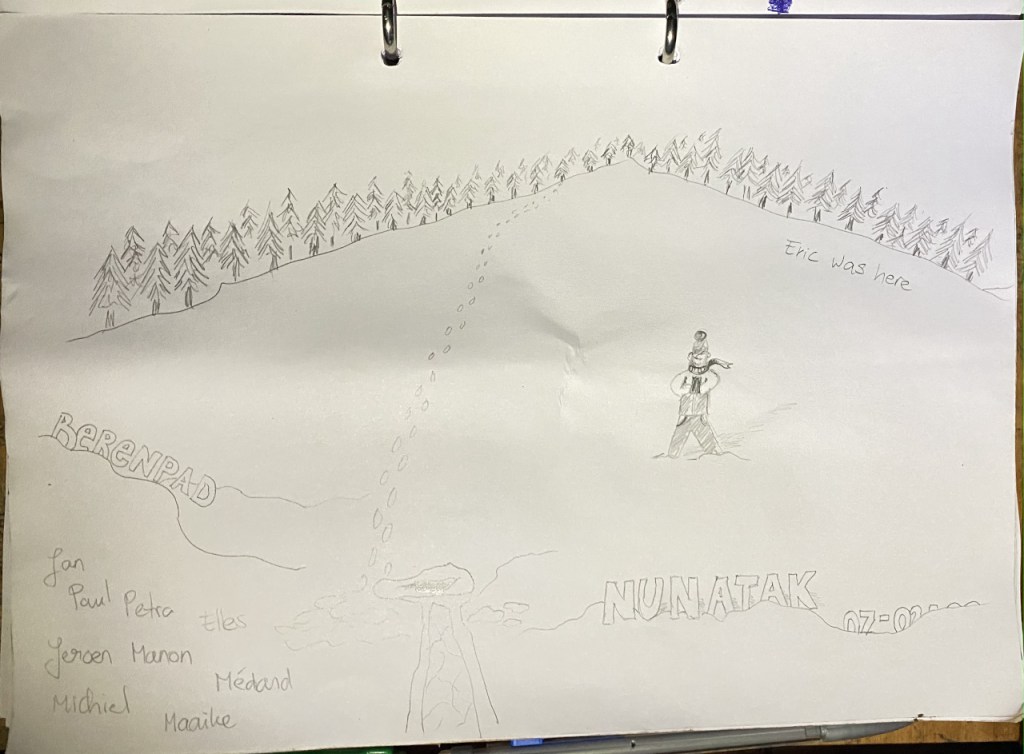In elke hut tekenen we het gastenboek in de vorm van een tekening. Met de naam van Nunatak erin uiteraard 😁
