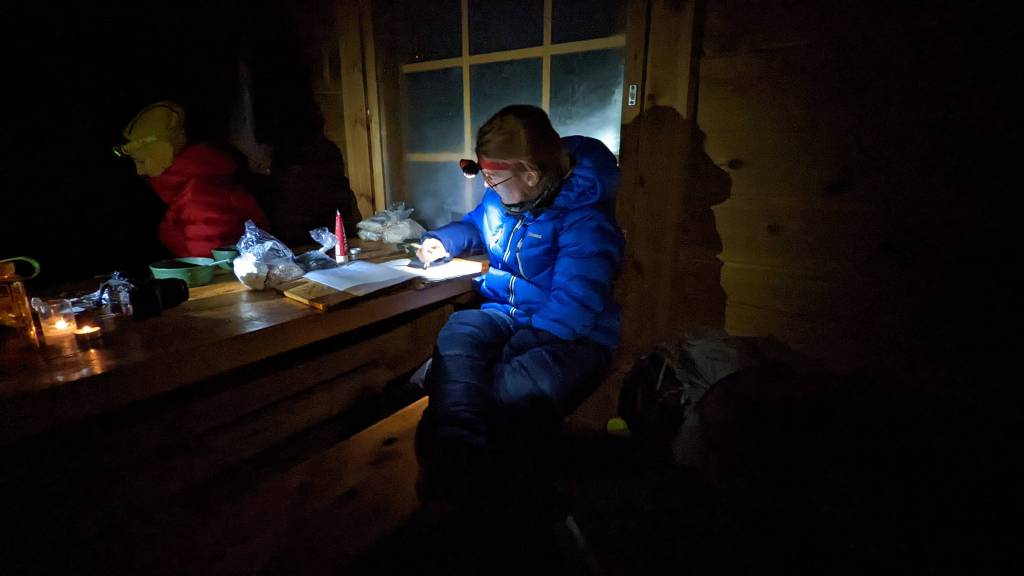 We hebben een hele leuke groep mensen bij elkaar. De hut na bijna 20 km (hoe vaker ik ga vertellen hoe langer hij wordt 🤪) is goed geïsoleerd en ruim. Goed warm te krijgen. Geen donsjas meer nodig over m’n slaapzak, zoals de nacht ervoor. En het is gezellig en we lachen wat af.