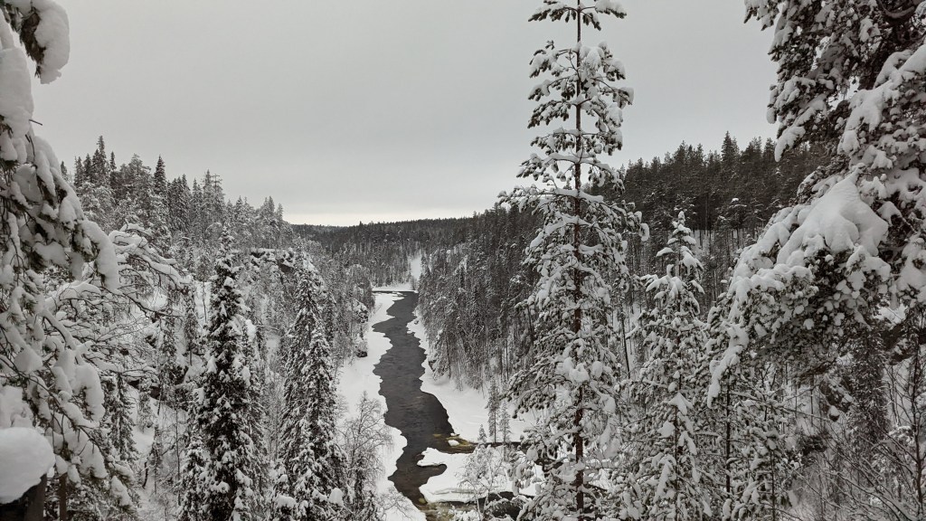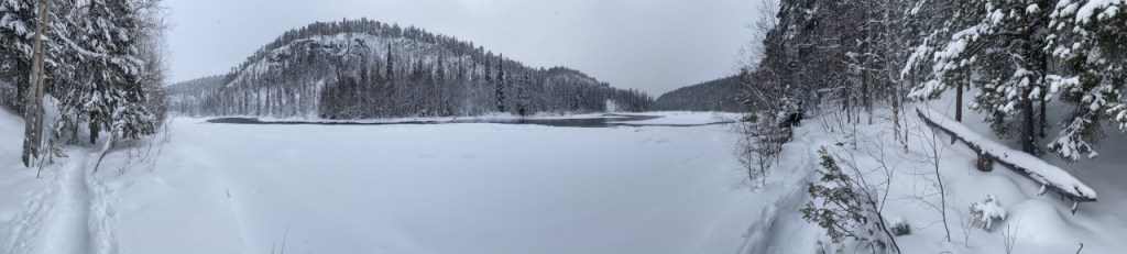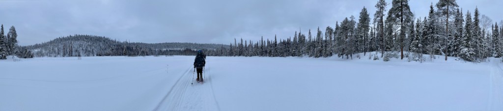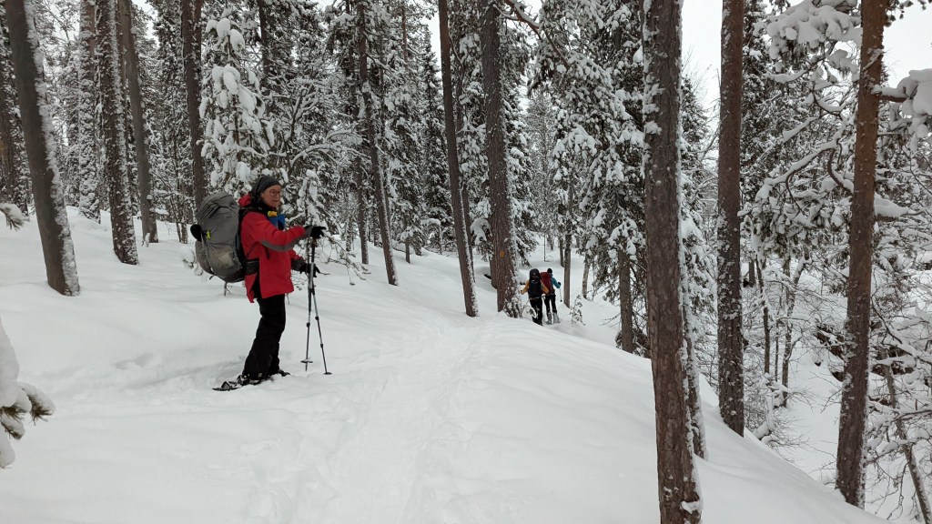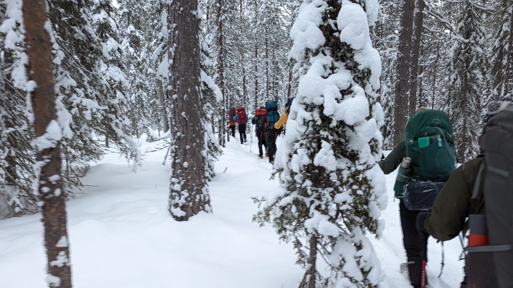 We lopen langs een meer, dat deels nog open ligt. Het sporen is leuk en soms val je op je knieën en mag je met de zware rugzak proberen op te staan. Automatisch prik je je stok in de sneeuw als steun, maar die zakt natuurlijk ook 60 cm weg… Blijft wennen!