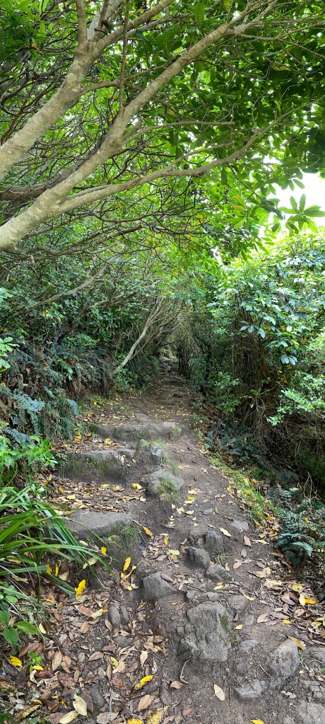 Elke keer verwacht ik een kromming of afbuigen naar echts om terug bij Kiwi cafe uit te komen. Maar we blijven maar stijgen en dalen en alsmaar door te gaan. Na een uur en bovenop een mooie berg toch Google maar even geraadpleegd. Het is geen rondje. Maar een daghike van 20km en ca. 9 uur wandelen van A naar B! 🤣