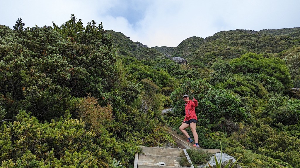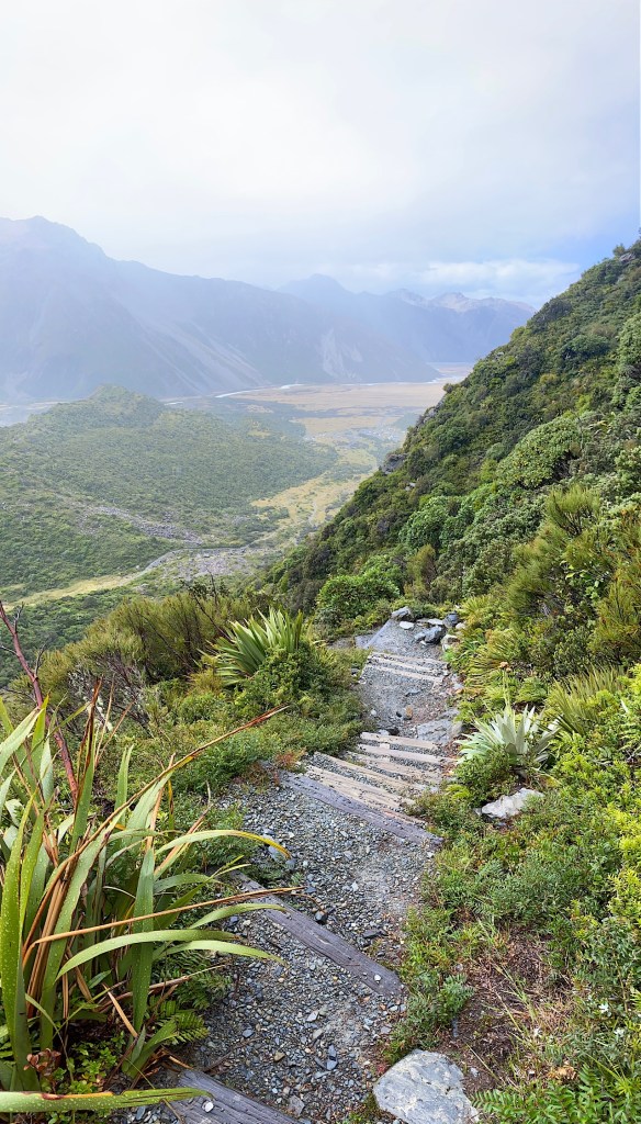 Na het lookout point lopen we terug naar de splitsing en gaan we de Sealy tarn track (stairway to heaven) lopen. Uiteindelijk komt die bij de Mueller hut uit (3-5 uur), maar wij mogen straks nog terug om naar het ski dorpje op 30-45 minuten enkele reis te wandelen, dus kiezen we voor de Sealy tarn track tot de benen moe worden van alle trappen. En dan gaan we voorzichtig weer terug via alle trappen naar beneden.