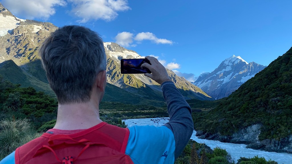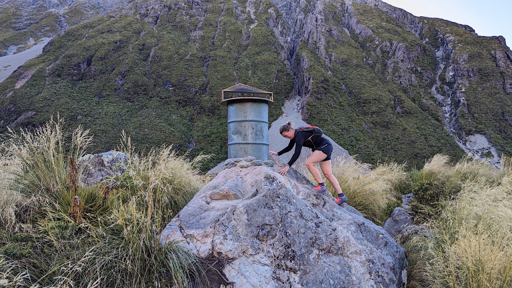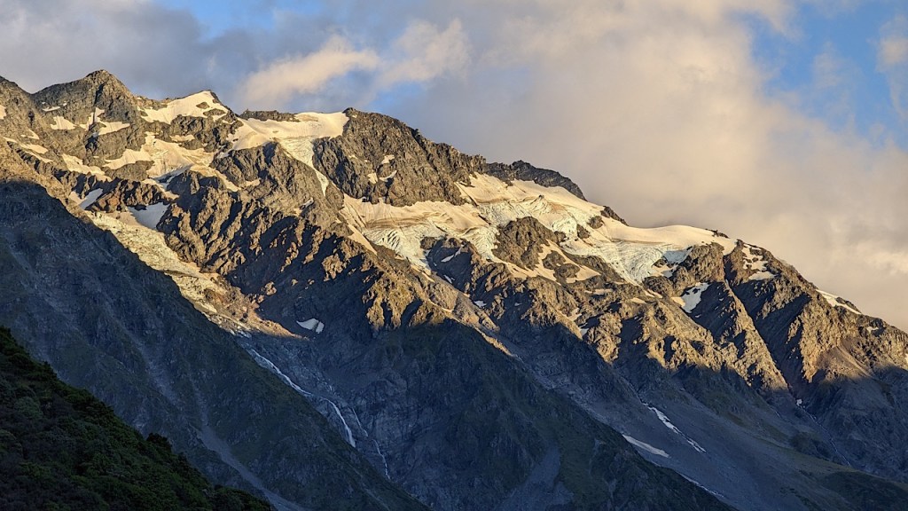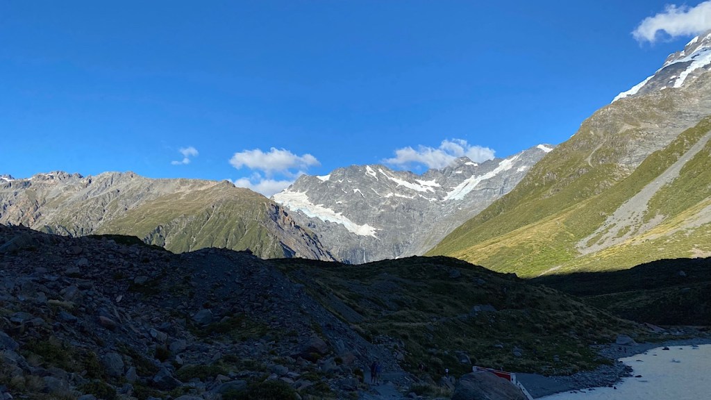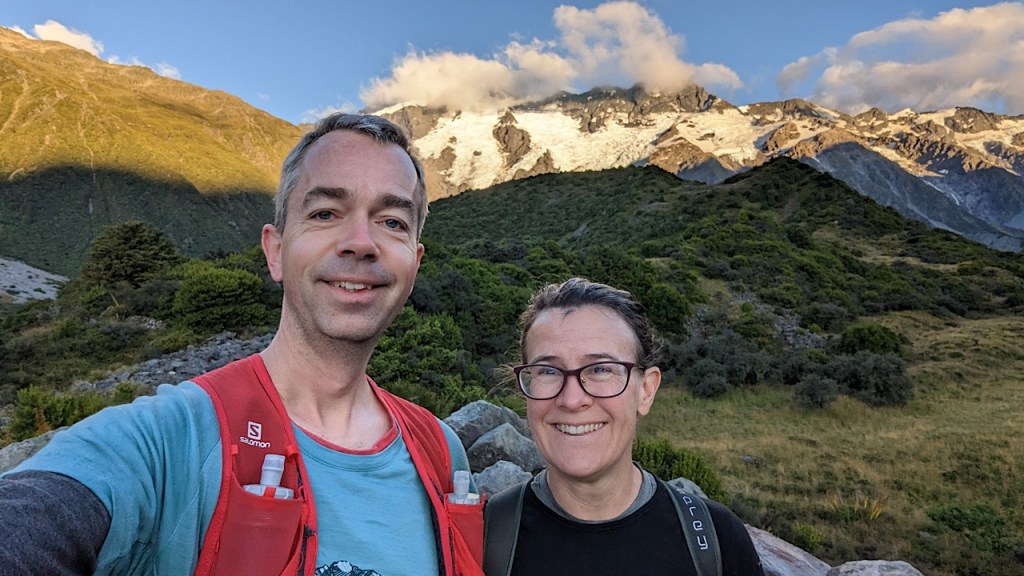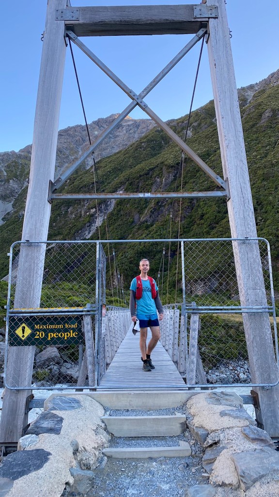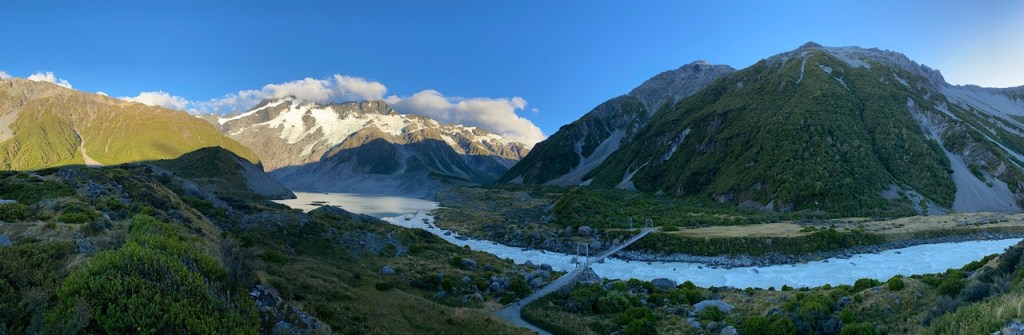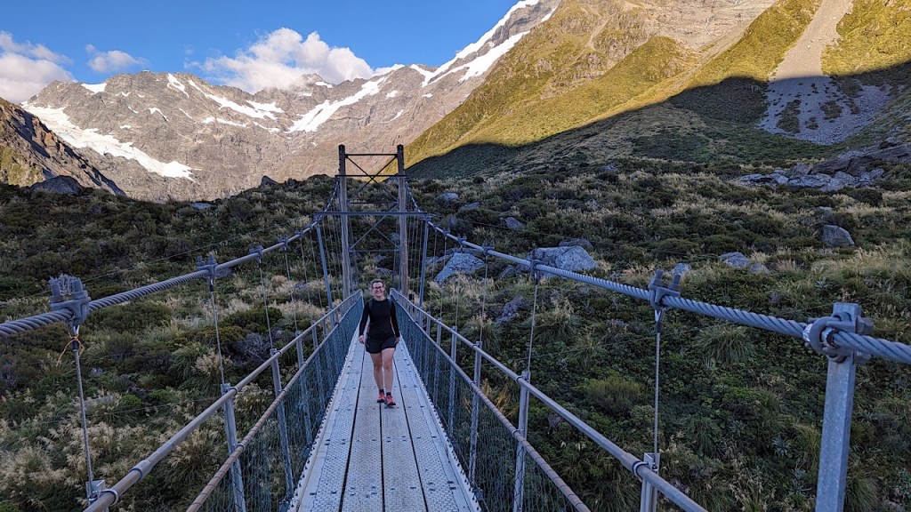 Er zijn nog enkele gelijkgestemden op de track. Het is nog koel en vlak voor de eerste hangbrug krijgen we zelfs een stevige wind. De zon komt op over de bergtoppen en schijnt op Mt Sefton en Mt Cook. Zo mooi!