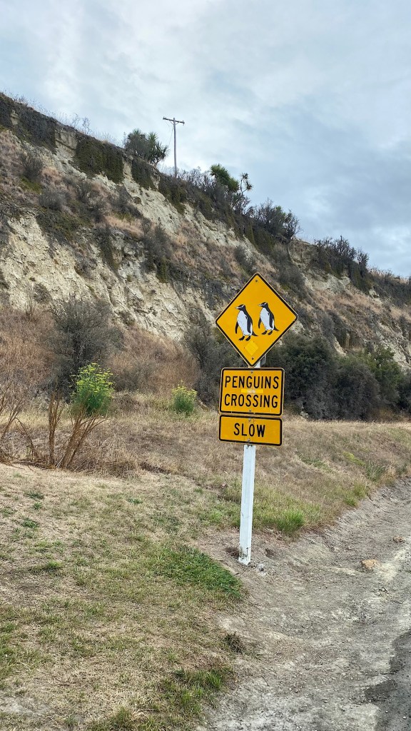 De waarschuwing langs de weg belooft een lading aan wilde pinguïns, mijn lievelingsdiertjes.