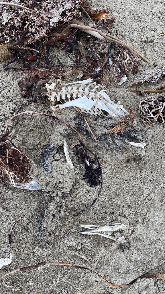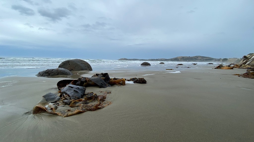 En hier tussen al het aangespoelde hout en bijzondere zeewier vinden we naast de schildpad-achtige stenen onze eerste pinguïn: