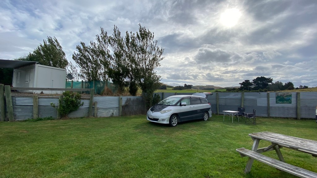 Het is een mini camping met warme douche en schone toiletten met uitzicht over de heuvels. Je raadt het al: het heet de Hillview campsite. Met om ons heen een kudde schapen aan de ene en een kudde koeien aan de andere kant.