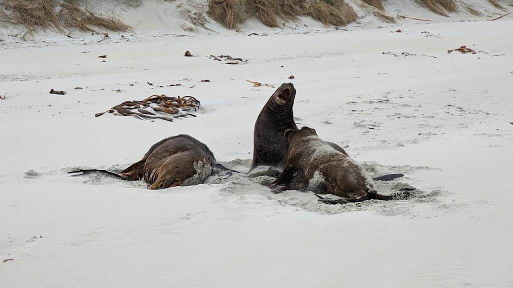 Ik wil net naar een stapel zeewier en aangespoeld hout lopen, wanneer ik bemerk dat het twee zeeleeuwen zijn. Oef. Goed afstand houden, zodat we ze niet storen en zij niet agressief worden.