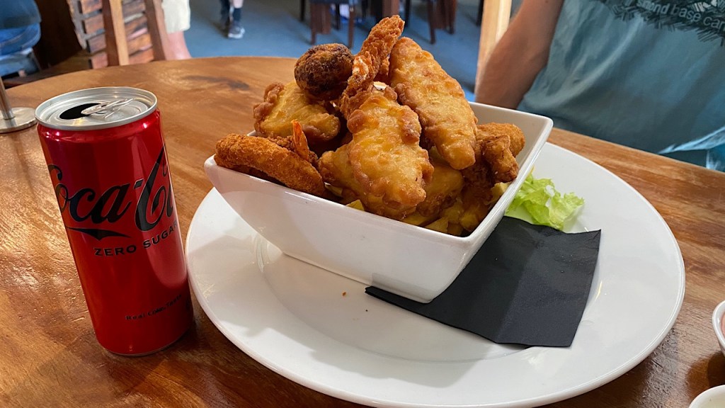 We houden het op een gezamenlijk schaaltje gefrituurde vissoorten en friet. Lekkah vet! Inktvisringen, cod, garnalen, iets dat op een oogbal lijkt en mosselen. Die laatste hebben we bewaard voor de afwasploeg š