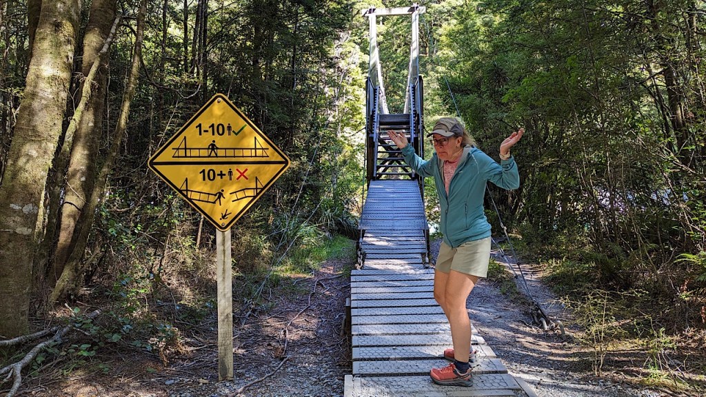 We liggen vlak voor de hangbrug in een deuk om het geplaatste verkeersbord š