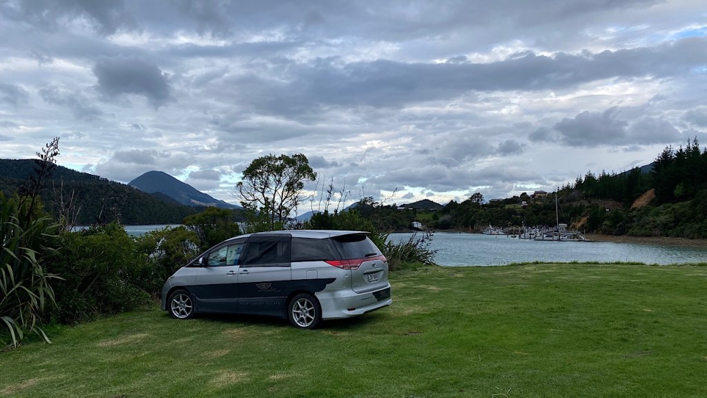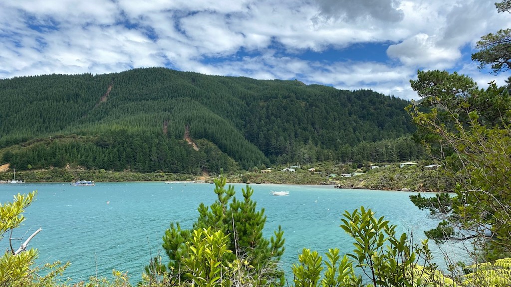 Van Tasman gaan we door naar Malborough. Via kronkelende bergweggetjes, waar regelmatig de helft naar beneden gestort is door de storm van augustus 2022, rijden we heel behoedzaam naar Elaine bay. Een lief klein plaatsje met een blauwe baai ervoor met uitzicht op de Malborough Sounds.