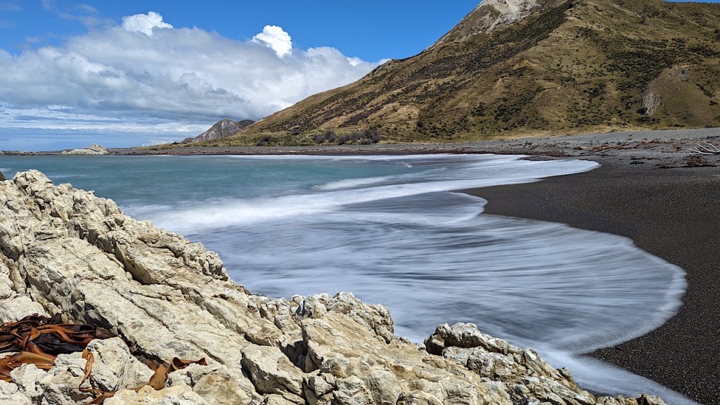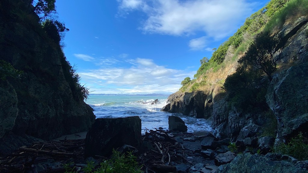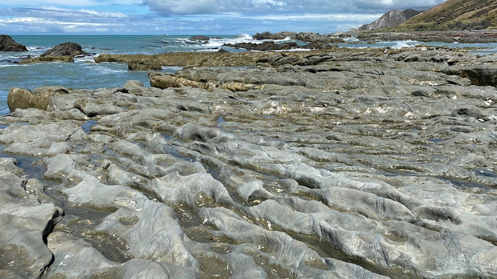 Aan het einde van de weg komen we uit op een kiezelstrand met hele bijzondere rotsen in de branding. We kletsen met twee import Kiwi’s, oorspronkelijk afkomstig uit de UK. Ze zoeken mooie stenen op het strand, die ze bewerken tot sieraden en verkopen op marktjes. Erg leuk om hun verhaal te horen.