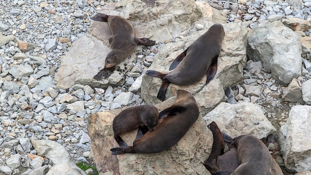 Vlak voor Kaikoura ligt het rotsstrand bommetje vol met zeeleeuwen en jonkies. Er is een parkeerplaats aangelegd, zodat je op je gemak en veilig naar beneden kan kijken. Grandioos!