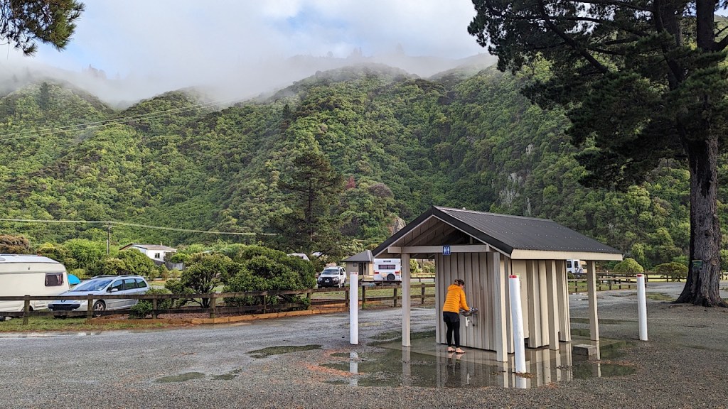We beginnen de dag in Rarangi bay met een hele natte camping. De toiletten staan onder water van alle regen, die vannacht gevallen is.