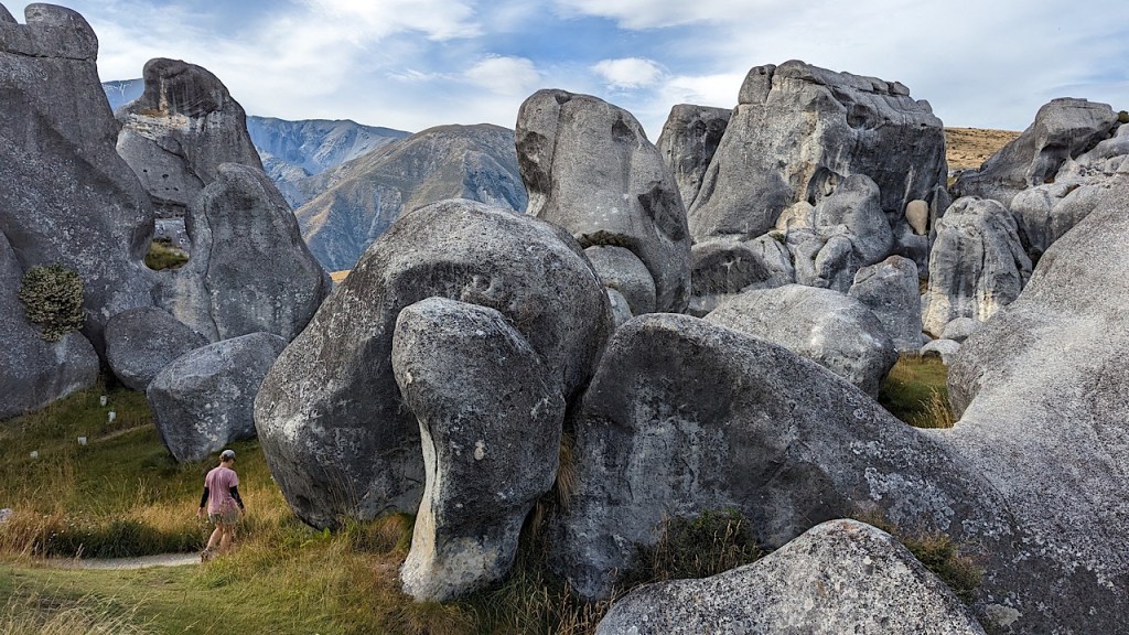 Je loopt er een mooi pad rondom en deels doorheen en mensen vanuit NZ komen hier om te klimmen en te boulderen. We zien een dame met een dikke matras aan komen lopen, die zonder klimtuig de rotsen gaat beklimmen.