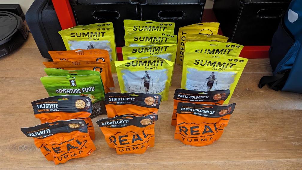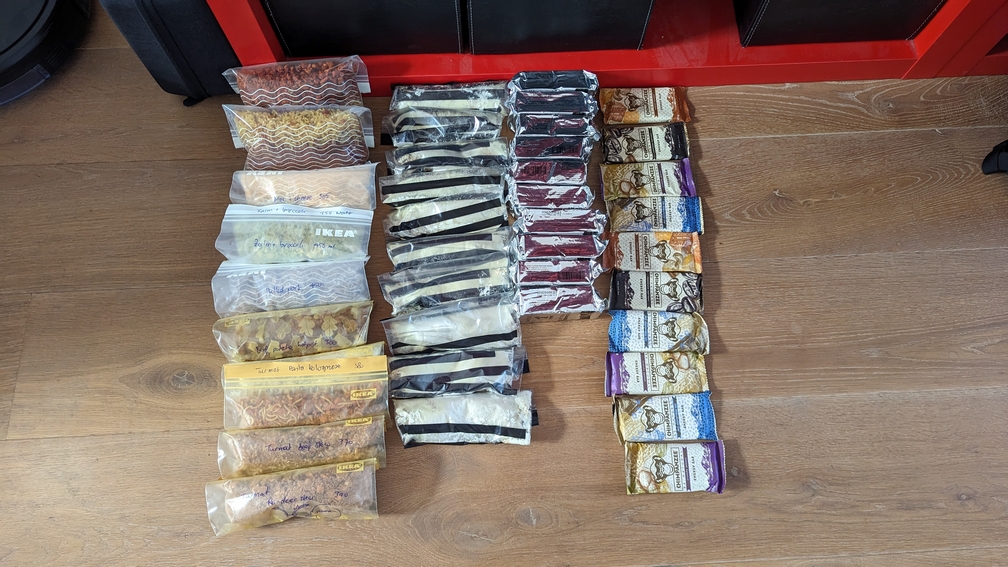 De avondmaaltijden (zakken gevriesdroogd eten) waren voor 10 dagen nogal volumineus. De halve rugzak zou dan vol zitten. We hebben ze daarom overgegooid in ziplocks van IKEA. Links zie je enkel de avondmaaltijden voor 2 personen. Rechts zie je ontbijt, lunch, snack én avondeten voor 1 persoon. Dát scheelt wel eventjes!