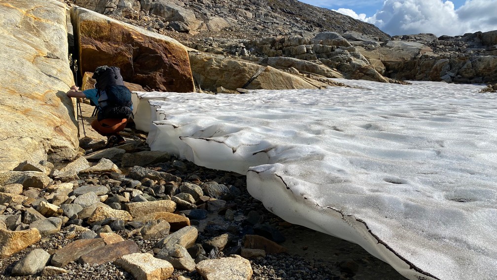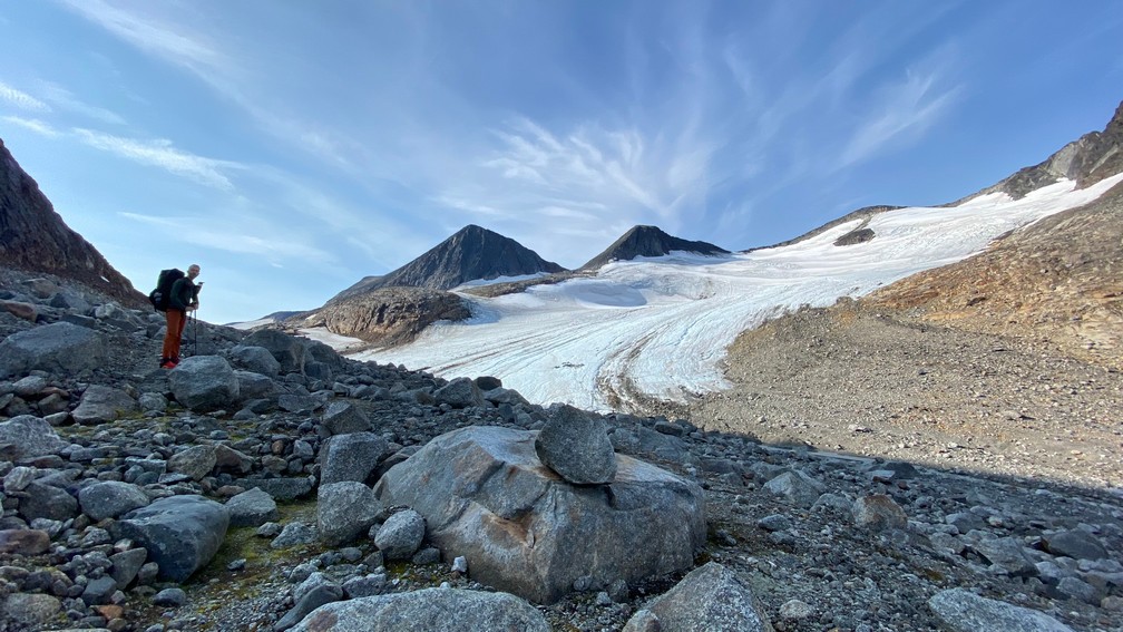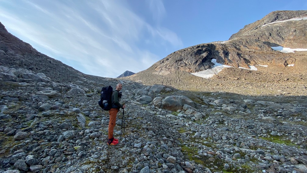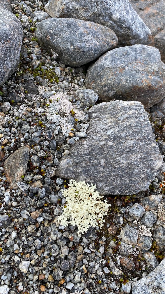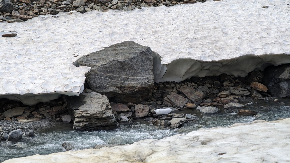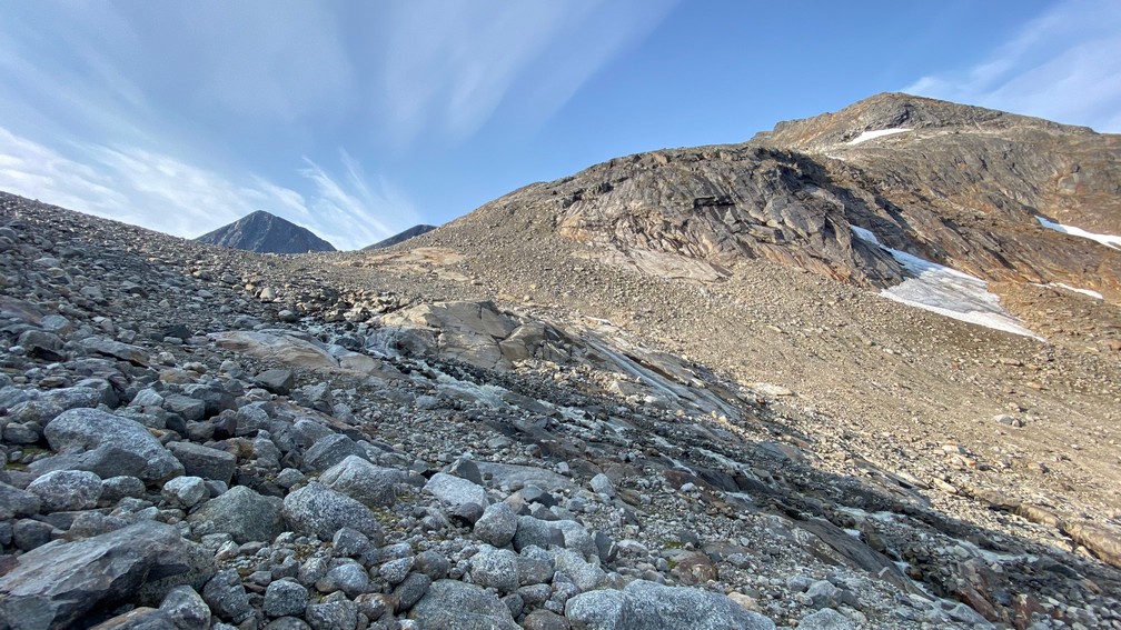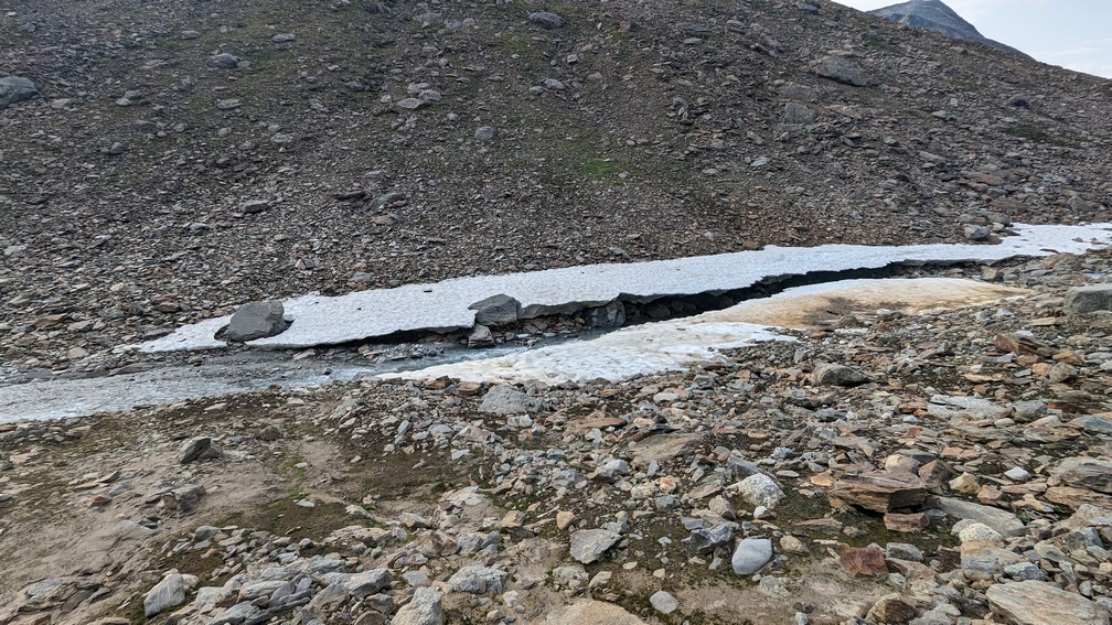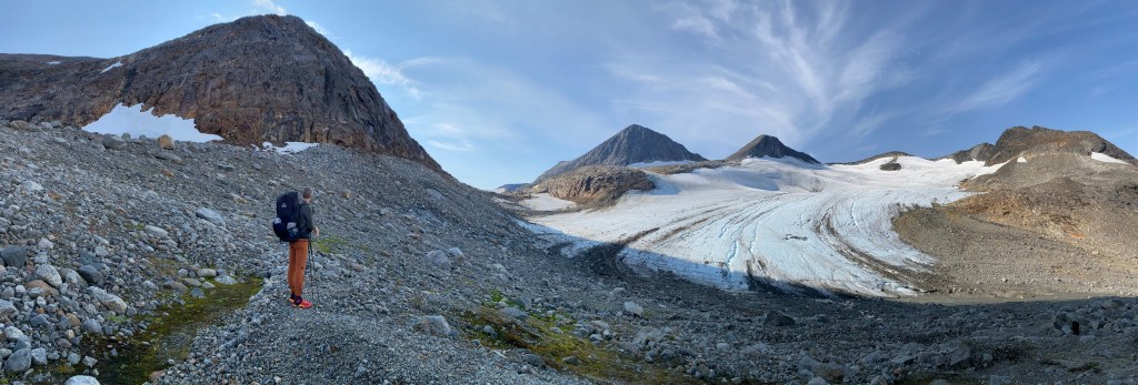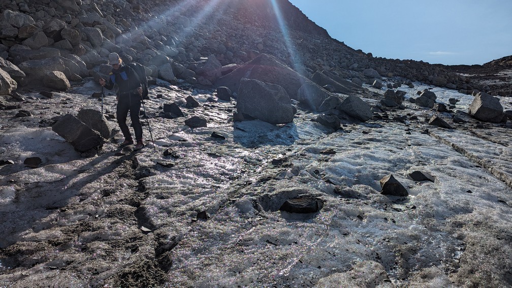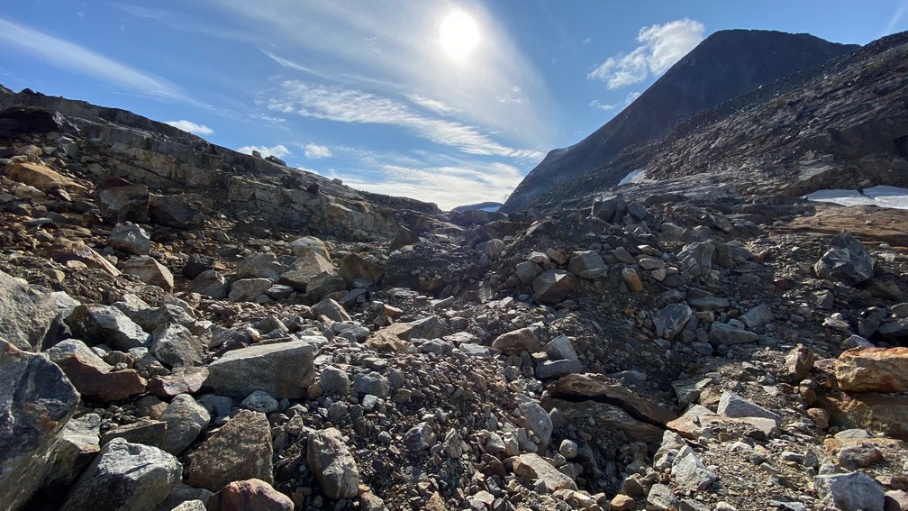 Want onderaan die stenen/rotsblokken ligt het ijs van de winter en de uitloop van de gletsjer, die van rechts (van de Huinarčohkka top) de vallei in loopt. Spekglad, tenzij je op het ijs wat zand of steengruis hebt liggen.