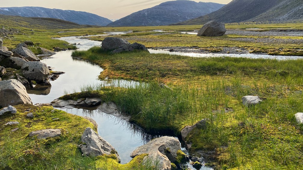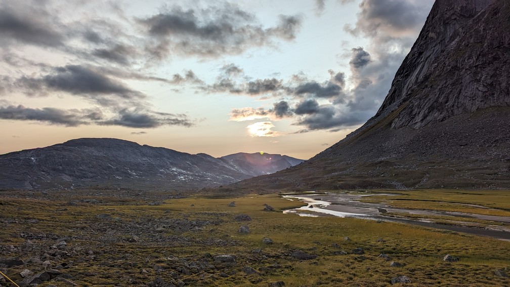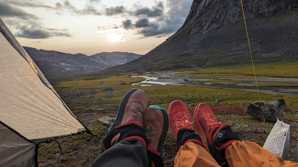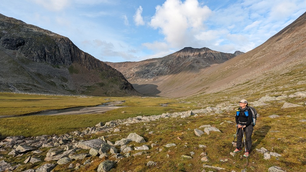 Het dal erna is prachtig en we zoeken naar een plek om de tent op te zetten. Ondertussen is het een uur of 4 ’s middags en gaat de zon al wat achter de bergen wegzakken. De hellinghoek van de bergen is helaas nog te stijl of het stuk vlak land blijkt een moeras te zijn, om snel de tent op te kunnen zetten. Ofwel liggen er teveel stenen. Ik ben wel een prinses op de erwt… er moet geen rotsblok onder mijn matje liggen, natuurlijk 😉
