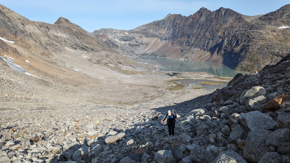 Gelukkig wordt het over de pas ‘normaler’. Geen ijs meer, maar gruis, stenen en hierover kunnen we tenminste zonder al teveel moeite verder hiken. Fijn. De zon schijnt en bovenop komen we bij een prachtig bergmeer.